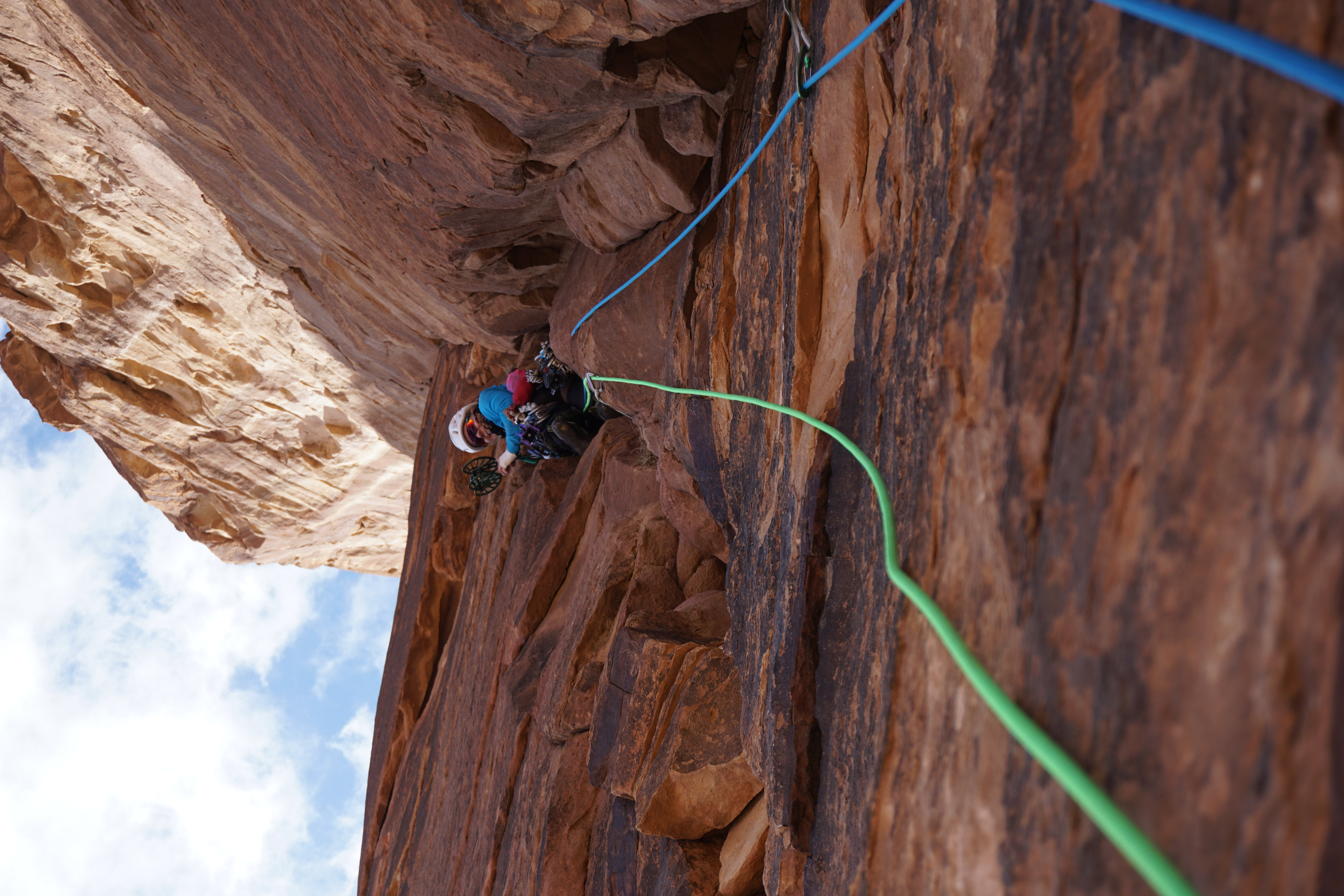 Atayek sier han skal kjøre samme vei, og tilbyr oss å sitte på lasteplanet på vei bortover. Vi takker ja, under mistanken om at han egentlig ikke skal samme vei, og blir bekreftet idet han slipper oss av og kjører tilbake til huset. Innmarsjen er en labyrint av bratte gallerier og smale passasjer, men som Ariadne selv guidet Gunnhild oss uanfektet til innsteget. Jeg vant stein-saks-papir og fikk første led, et kunstverk av et hjørne med gode sikringer hele veien. Lett pumpet får jeg damene til standplass, og den neste t.l. er en drøm - velsikret kamin- og håndjammer i 30 meter - det er nesten vemodig å komme på stand, nå mine led er overstått. Glad for å slippe cruxet overleverer jeg ledet til Gunnhild - “Bissa”, som vi kaller henne.