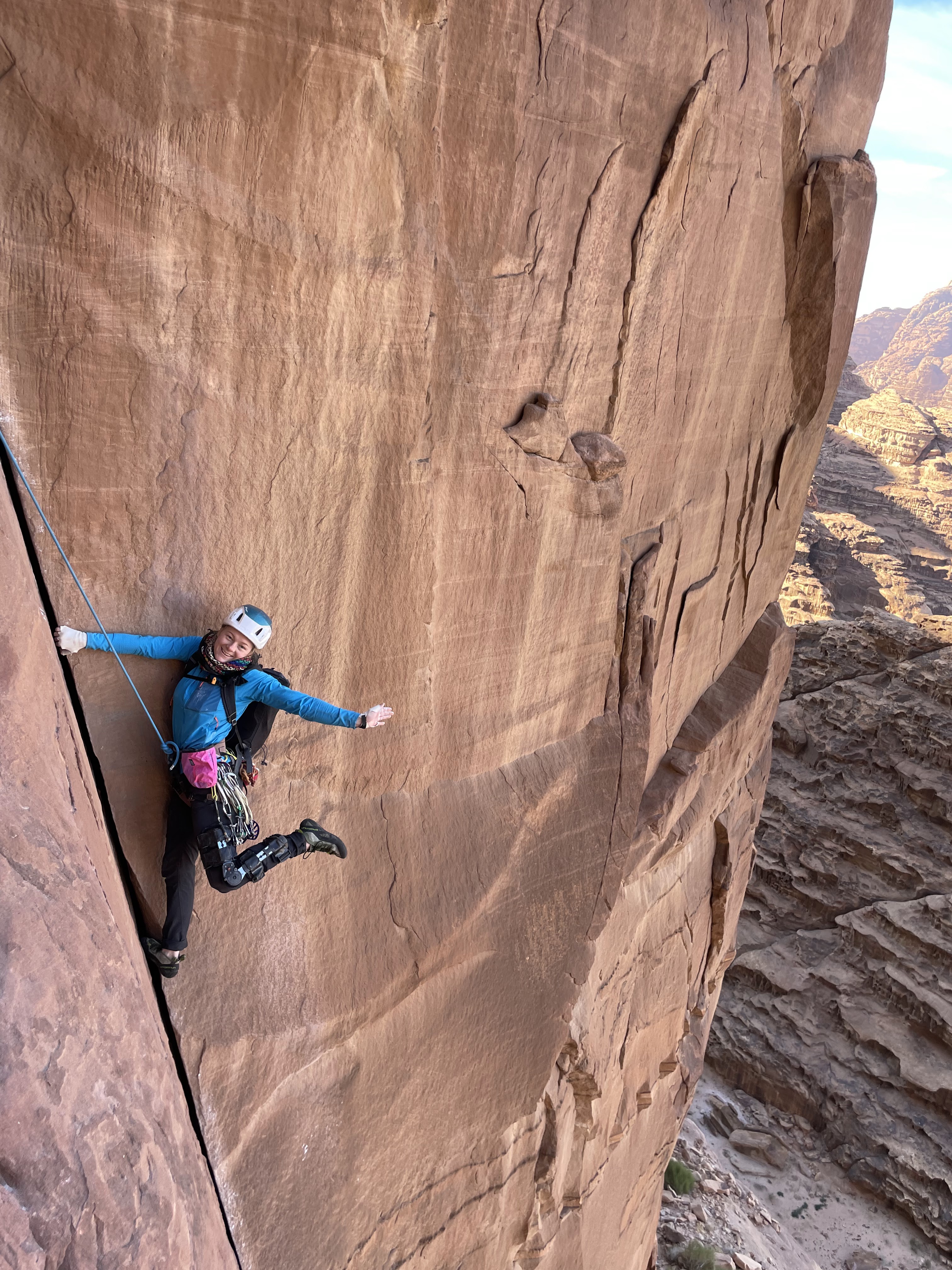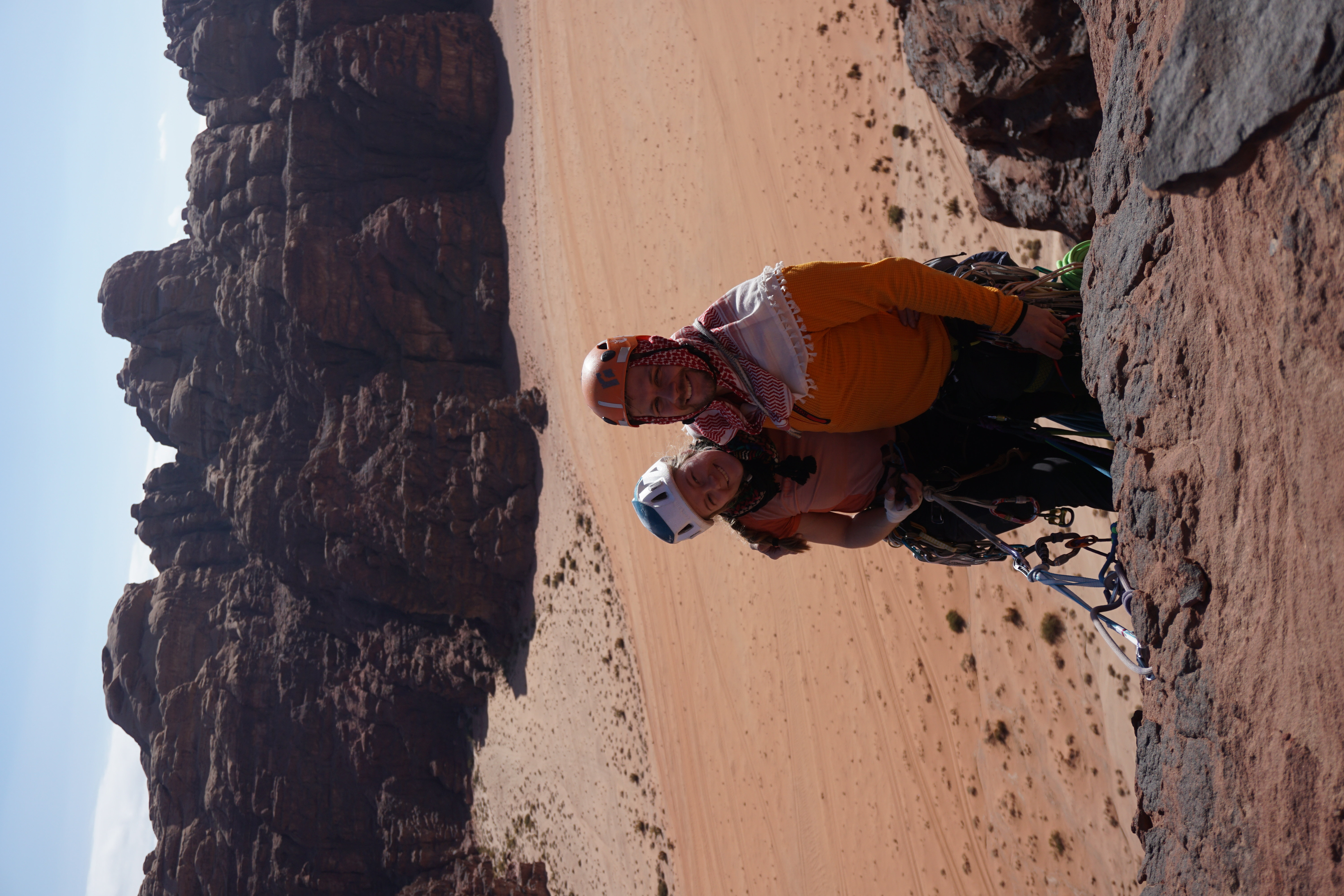 Idet vi kaster tauet ser vi «Vestlandstaulaget» Emil, Noralf og Synne gå i gang med 7. t.l., til stor underholdning for oss. Med god tid spiser vi lunsj mens vi ser Emil jobbe seg oppover, og kommer raskt ned resten av ruta. Johannes går over til ørkecampen for å vente på Atayek mens jeg legger meg bak en stein og spiller munnspill mens jeg venter på Vestlendingene. Vel tilbake i Wadi Rum er menyen som før - kylling og ris.