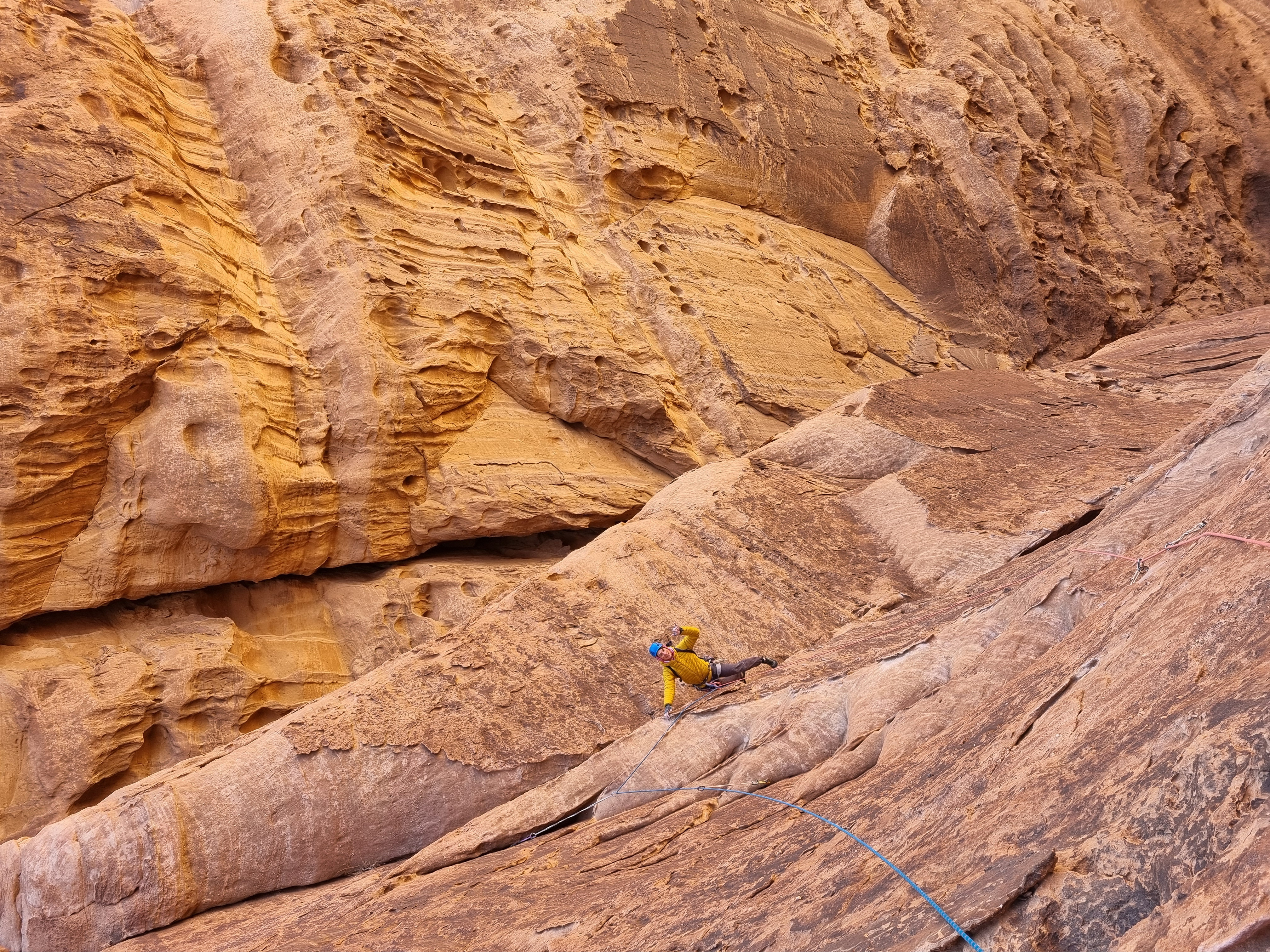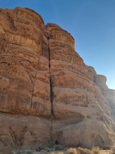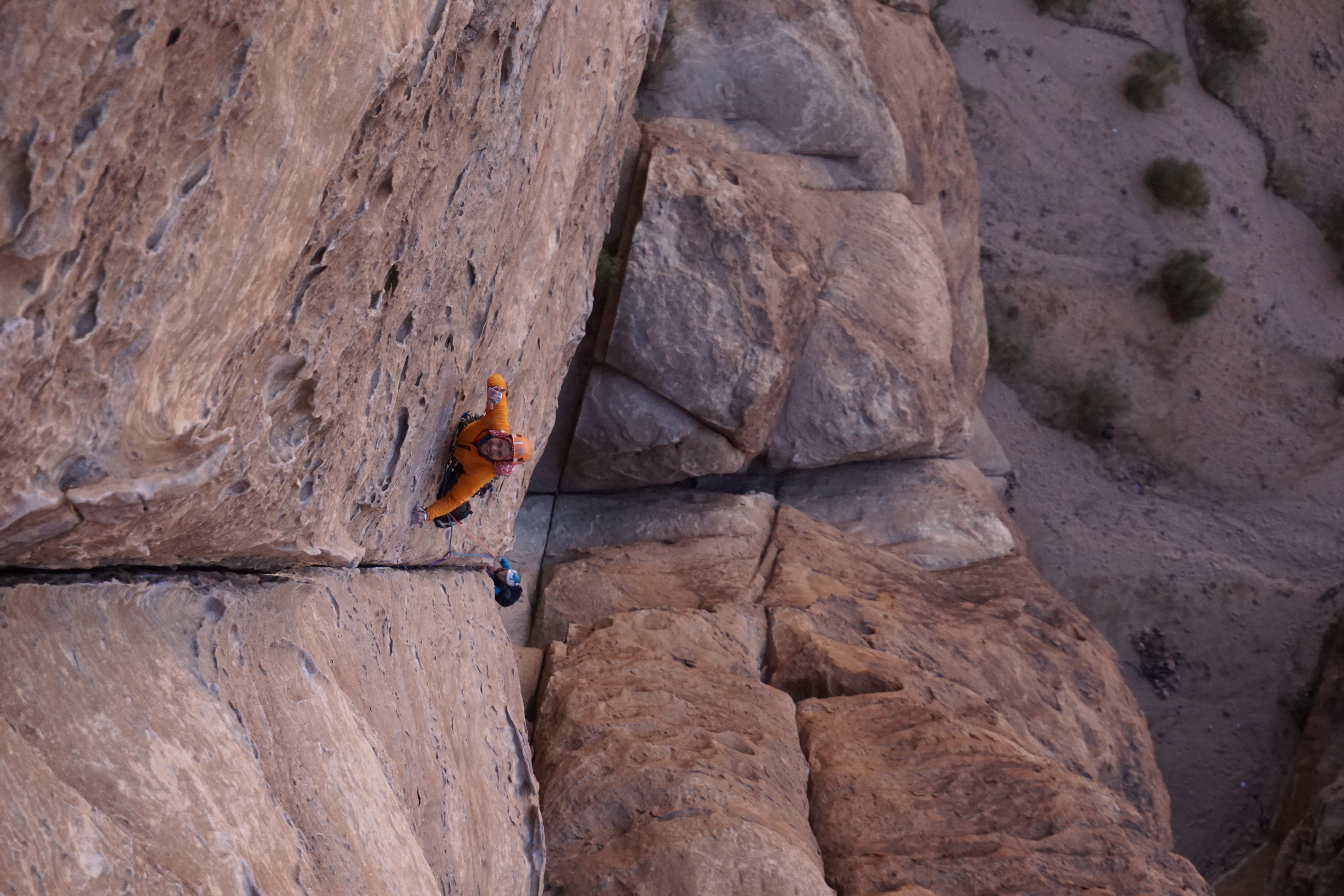 Første klatring er Merlins Wand - 5 taulengder opp en nordvendt, sammenhengende sprekk. Skyggeklatring er nemlig optimalt, selv på vinterstid, hvor det “bare” er 20 grader om dagen. Jeg får første blokk og er godt fornøyd med rutefinningen her - på tross av fottak som smuldrer opp under meg er det fantastisk å klatre i en rett sprekk hele veien. Vilde tar andre blokk, opp til og forbi «Allahs Øye», en hule på størrelse med en vanlig Osloleilighet til under 3 mill. I likhet med en slik studentbolig er utsikten og beliggenheten optimal, men innskrenketheten og den stramme duften av urin gjør at vi fort beveger oss videre oppover. Vilde går imponerende rett opp det guideboken beskriver som et «lett beskyttet sva» - altså lett som i knapt, ikke enkelt. Vi når toppen og ser endelig hvor langt ute i ørkenen vi faktisk er. Det er fint å se, endog en påminnelse om hvor alene vi er hvis noe skulle gå galt. Jeg sjekker knuta en ekstra gang før vi rappellerer ned.
