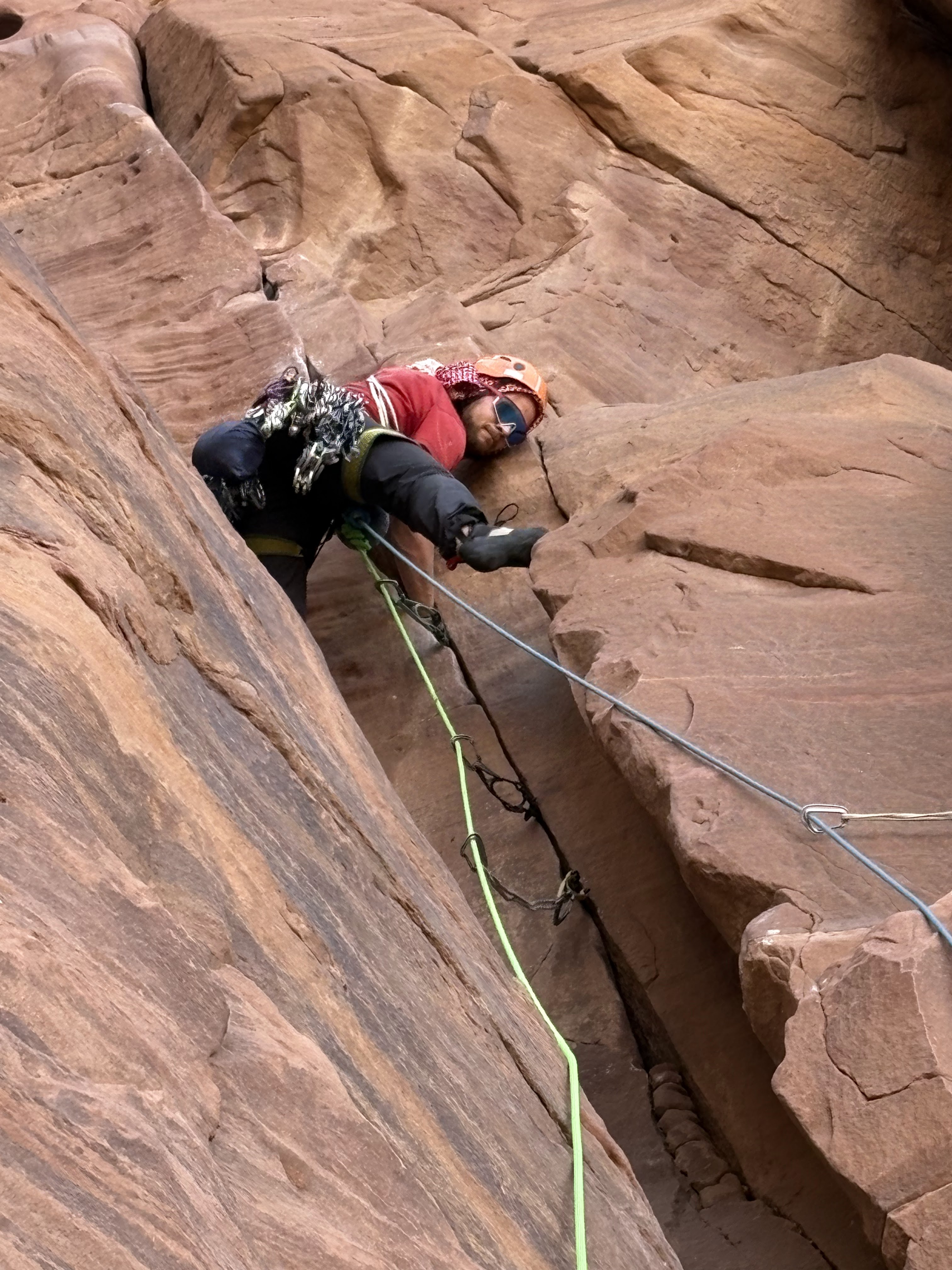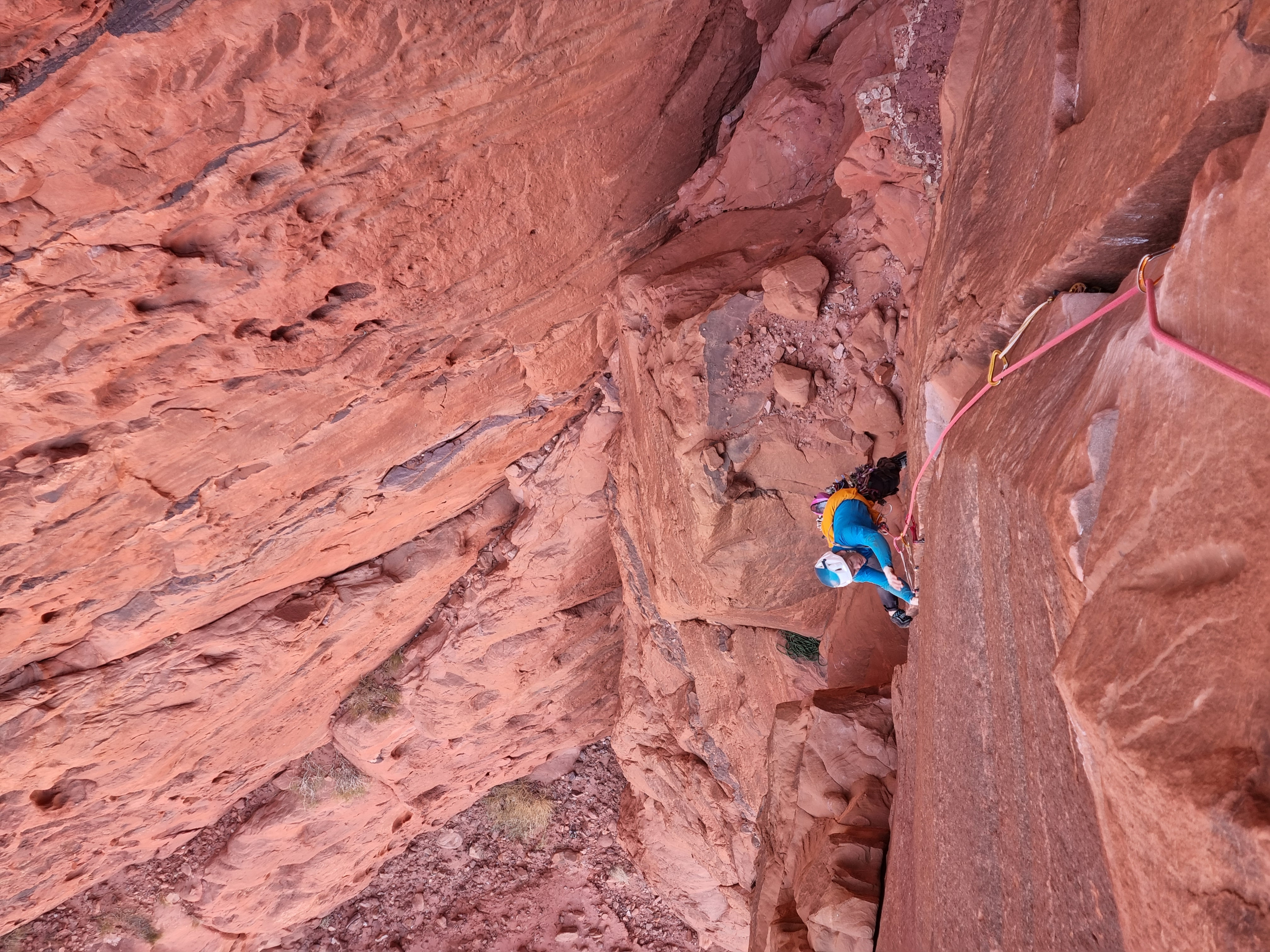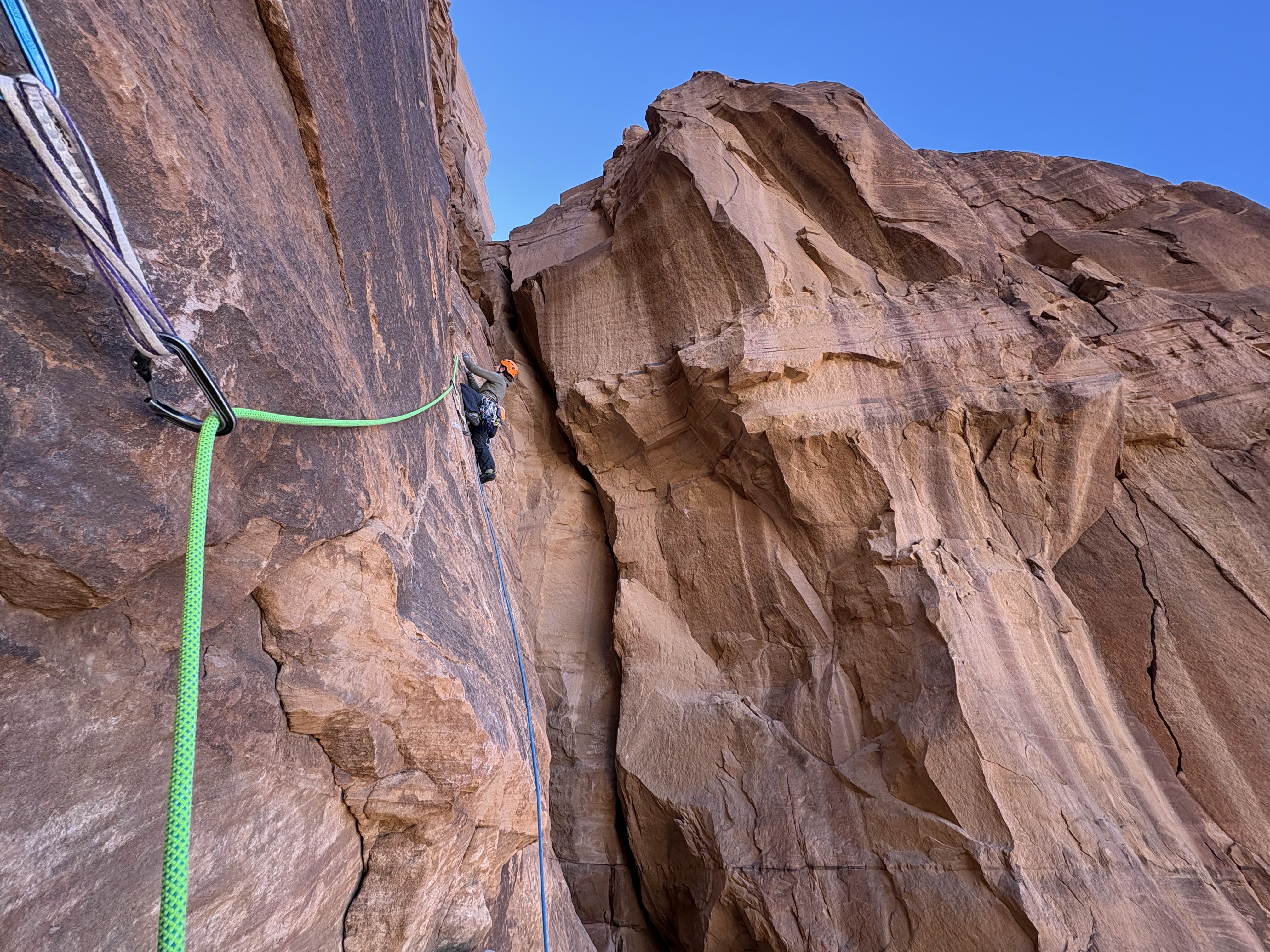 Første klatring er Merlins Wand - 5 taulengder opp en nordvendt, sammenhengende sprekk. Skyggeklatring er nemlig optimalt, selv på vinterstid, hvor det “bare” er 20 grader om dagen. Jeg får første blokk og er godt fornøyd med rutefinningen her - på tross av fottak som smuldrer opp under meg er det fantastisk å klatre i en rett sprekk hele veien. Vilde tar andre blokk, opp til og forbi «Allahs Øye», en hule på størrelse med en vanlig Osloleilighet til under 3 mill. I likhet med en slik studentbolig er utsikten og beliggenheten optimal, men innskrenketheten og den stramme duften av urin gjør at vi fort beveger oss videre oppover. Vilde går imponerende rett opp det guideboken beskriver som et «lett beskyttet sva» - altså lett som i knapt, ikke enkelt. Vi når toppen og ser endelig hvor langt ute i ørkenen vi faktisk er. Det er fint å se, endog en påminnelse om hvor alene vi er hvis noe skulle gå galt. Jeg sjekker knuta en ekstra gang før vi rappellerer ned.